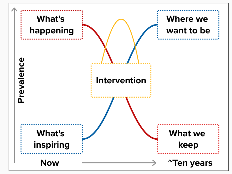 The objective of the workshop was to see what that middle wave (‘the intervention’) could and should be from our stakeholders’ perspectives. We thought if the right variety of people think about and then detail how we go from ‘the situation’ to ‘the vision’, we’d begin the refresh process with a rough but immediately usable understanding of the directions of travel most enabling to stakeholders.